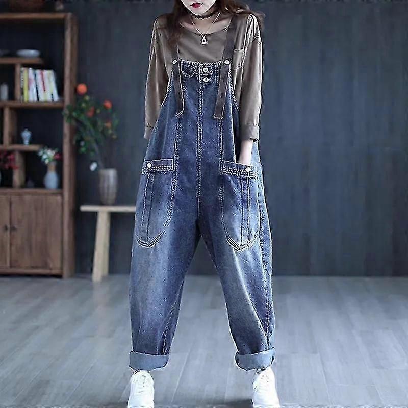Spring and Summer Women's Retro Big Pocket Loose Denim Overalls