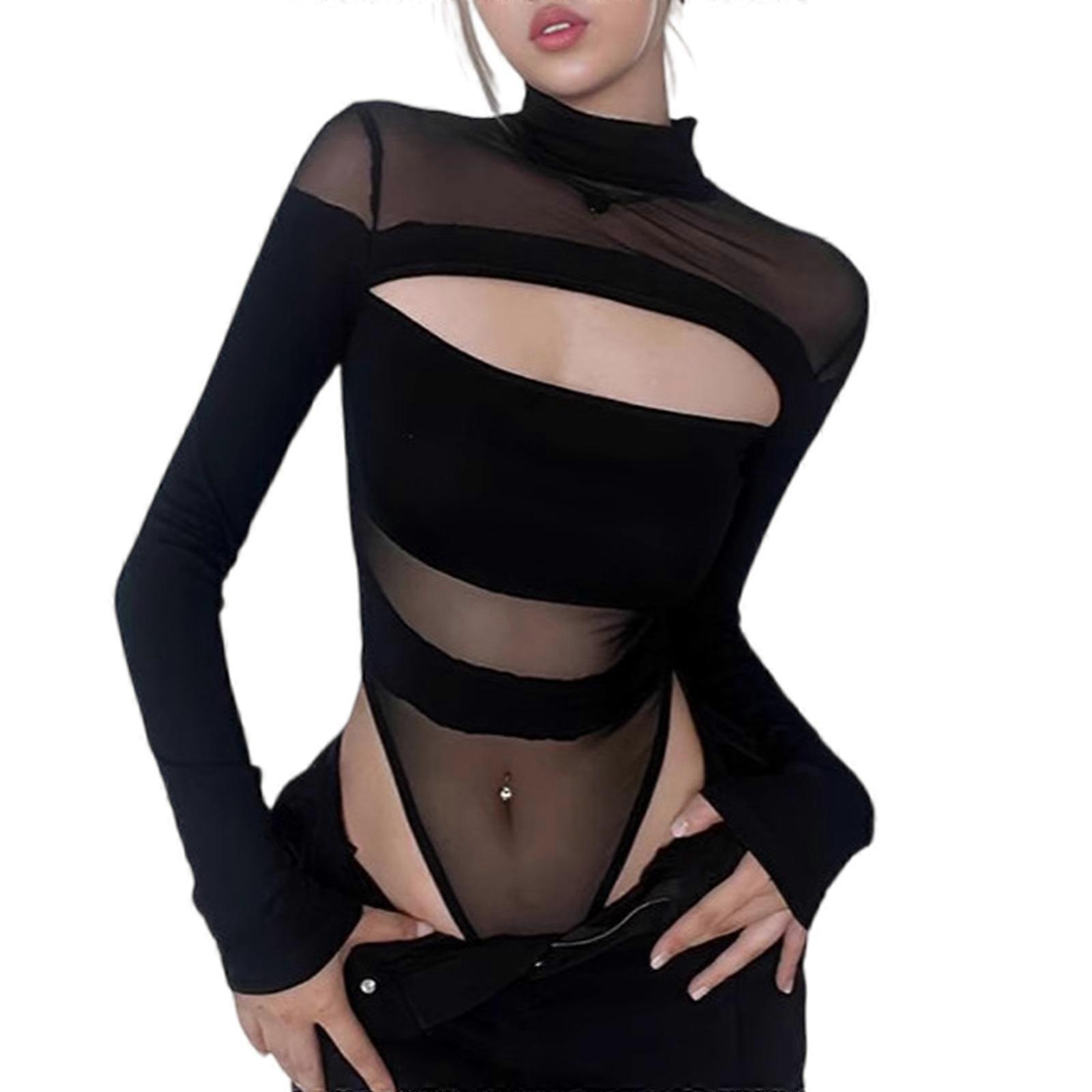 Elegant Early 2000s Fashion Encouraged Net Paneled Tall Neck Long Sleeve Overall For Women Party Outfit XL