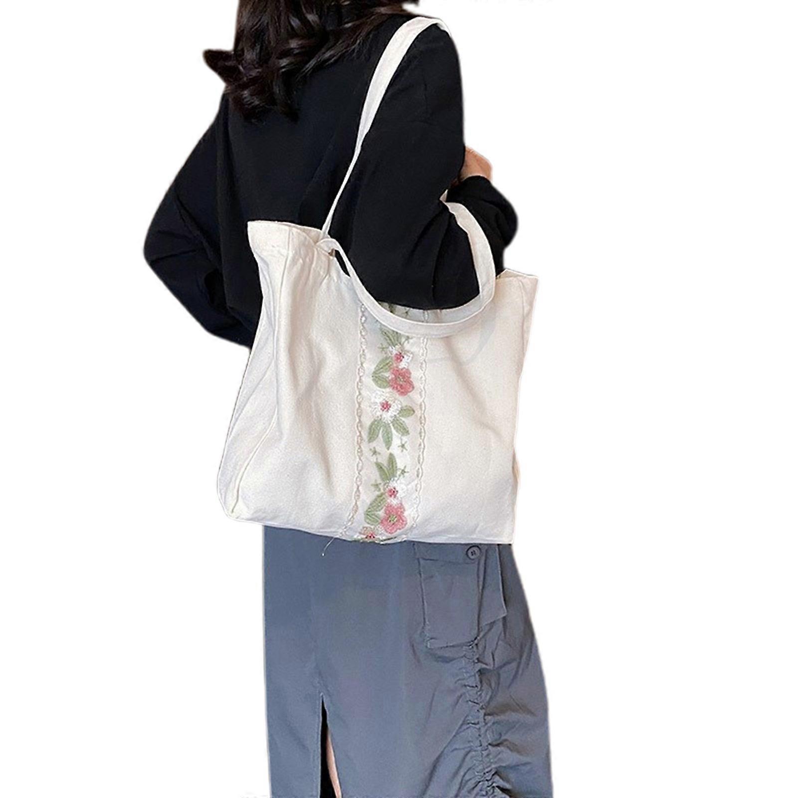 Fashion Women Large Capacity Canvas Bag Embroidery Flower Shoulder Bag Casual Travel Work Shopping Underarm Handbag White
