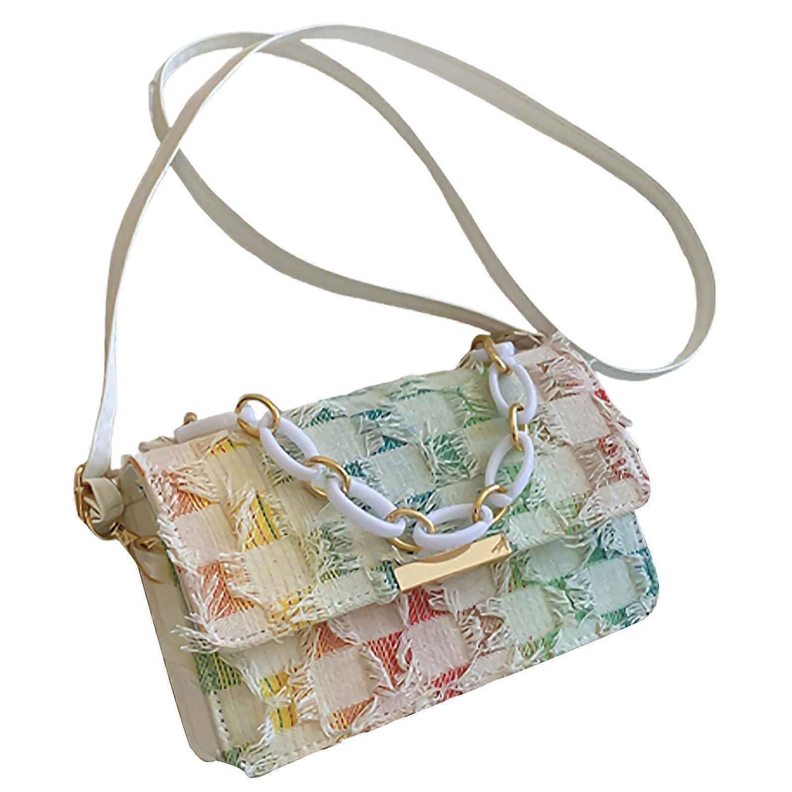 Fashionable Womens Handbag with Chain Handle Distressed Denims Tassels Shoulder Bag Checkered Jeans Flap Crossbody Purse color
