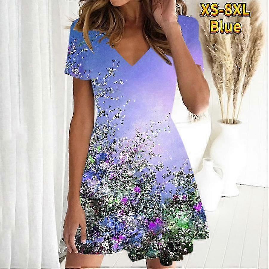Summer Fashion Women's V Neck Short Sleeve Oil Painting Flowers Printed Dress Sex Short Skirt Dresses