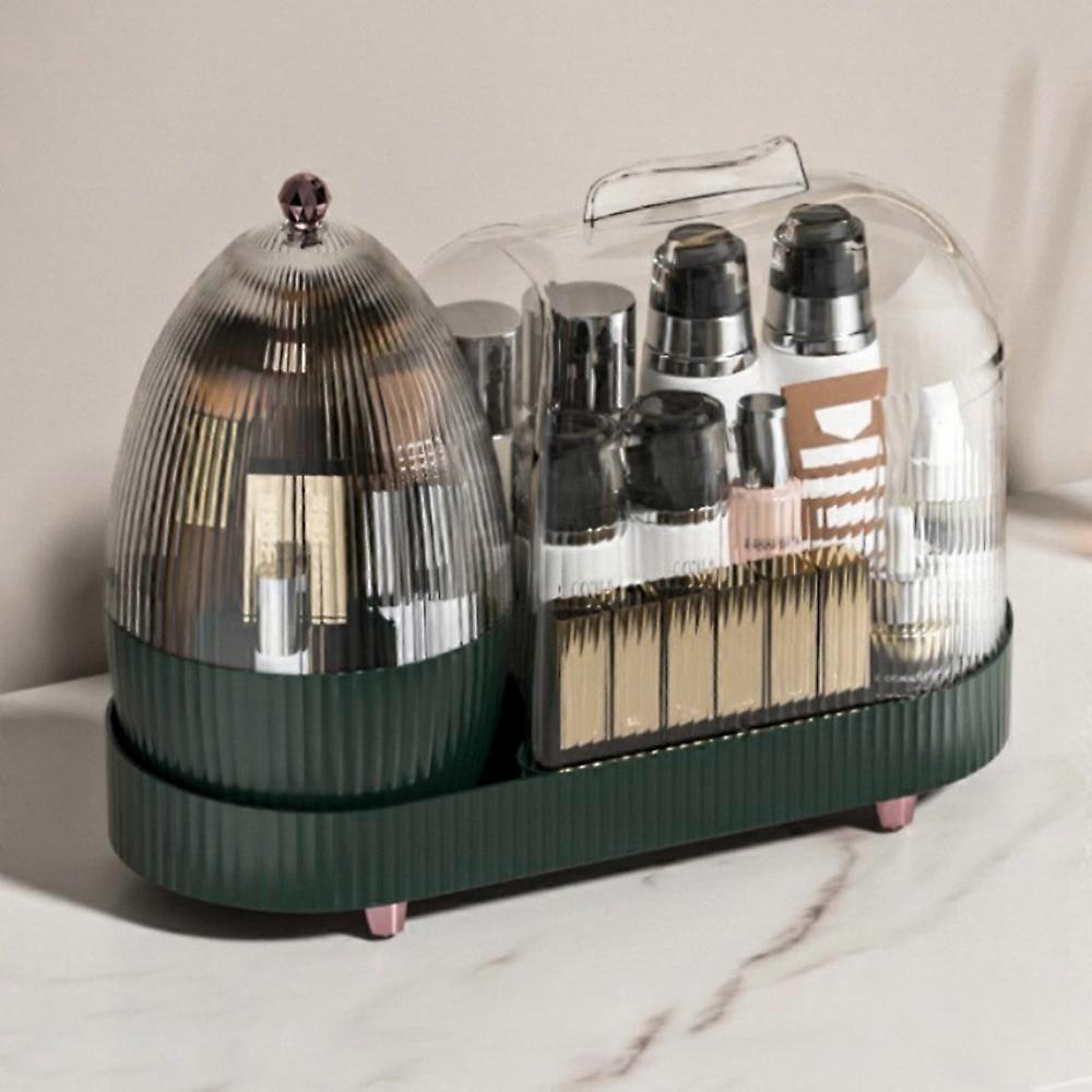 •【Dual-Section Design】Features two main compartments: one rotating section for brushes and one divided section for various cosmetics,offering organized and efficient storage. •【360° Rotating Brush Holder】The rotating section allows easy access to makeup brushes,preventing clutter and saving time when selecting tools. •【Transparent Dust Cover】A see-through protective cover shields cosmetics from dust and splashes while maintaining visibility of contents. •【Large Capacity】Spacious design accommodates tall bottles and a wide variety of makeup products,keeping everything neatly organized and easily accessible. •【Stable Base】Thickened bottom design ensures stability,preventing tipping and protecting your cosmetics. Specifications: •Dimensions: 37 x 15 x 28 cm •Material: PP + PET Package included: •1 x Cosmetic Storage Box •Not included other items