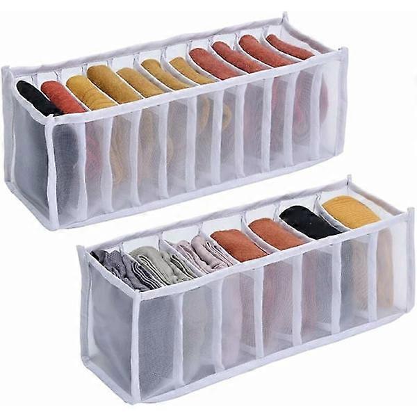 Foldable Drawer Organizer - 2 Pcs Underwear Storage, Clothes Drawer Organizer, for Socks, Underwear, Baby Clothes, Ties, White Usage: Ideal for storing small items like underwear, panties, socks, leggings, ties, and handkerchiefs. The easily foldable design suits various locations such as cabinets, dressers, and closets, simplifying and organizing your life. Multifunctional Sorting Design: Our storage box features 7 compartments (32 x 12 x 12 cm) and 11 compartments (32 x 12 x 12 cm) options, allowing for easy classification and organization of items, keeping your living space tidy. High-Quality Material: We carefully selected nylon mesh material to ensure the product is well-made, tightly woven, durable, and not easily deformed. It also boasts good breathability to prevent odors, providing a longer lifespan. Foldable Design: The clothes storage box is designed with 11 and 7 independent grids, convenient to fold without taking up too much space, easily keeping your closet and drawers neat and organized. The unique visible grid storage box makes it easy to find the clothes you need, saving time and space. Easy to Clean: Our clothes storage box can be directly washed with water to keep it hygienic and clean. The fabric is ventilated and breathable, effectively keeping clothes fresh. A simple cleaning before use is recommended.
