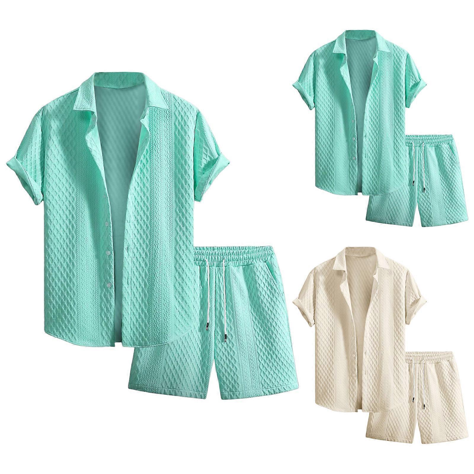 2025 Men'S Clothing Casual Two Piece Set Loose Plus Size Solid Button Down Short Sleeve Shirt & Elastic Waist Belted Shorts Suit