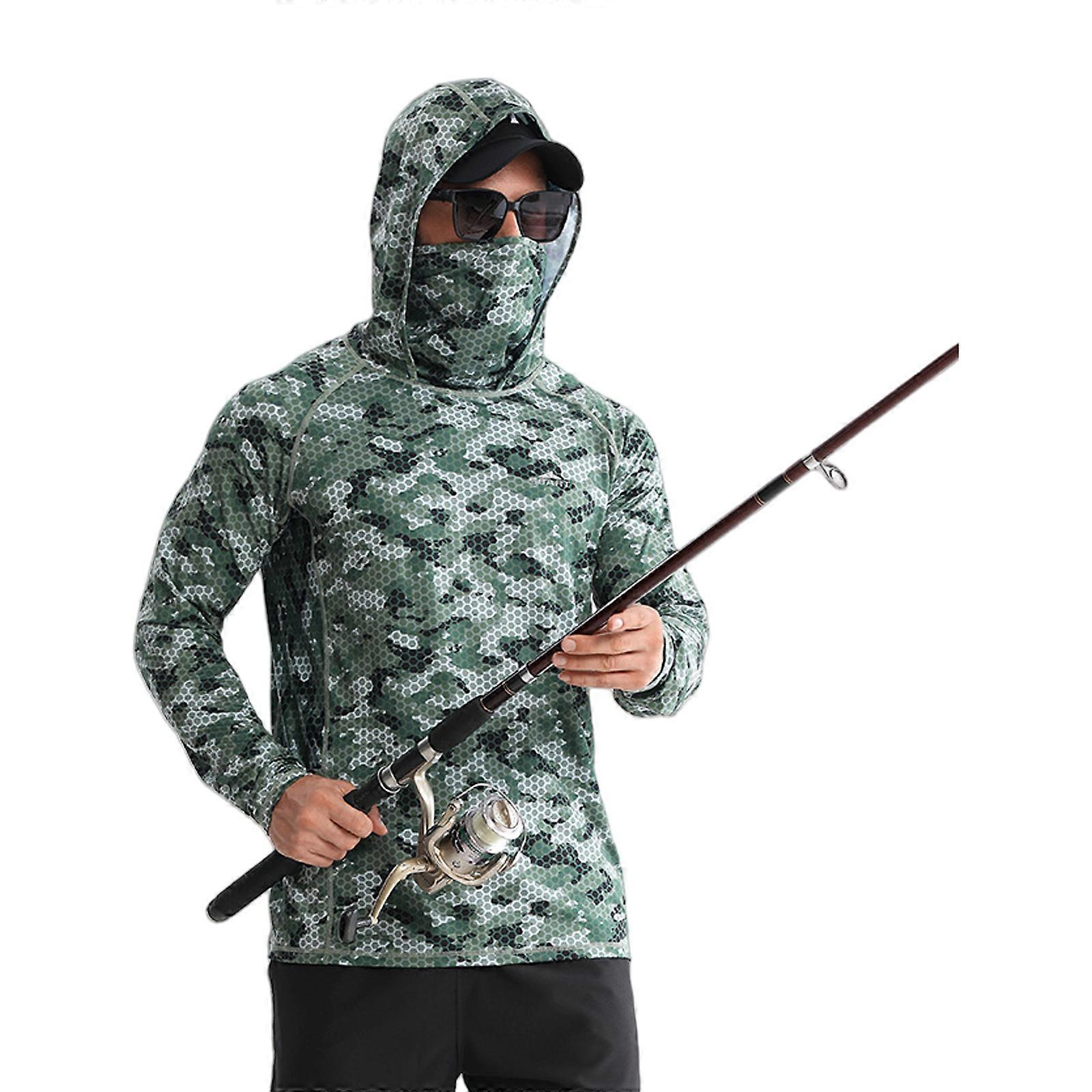 Breathable Hooded Fish Clothing Men Fishing Shirt with Face Mask Summer Sun Protections Angling Shirt Long Sleeve Camouflage green