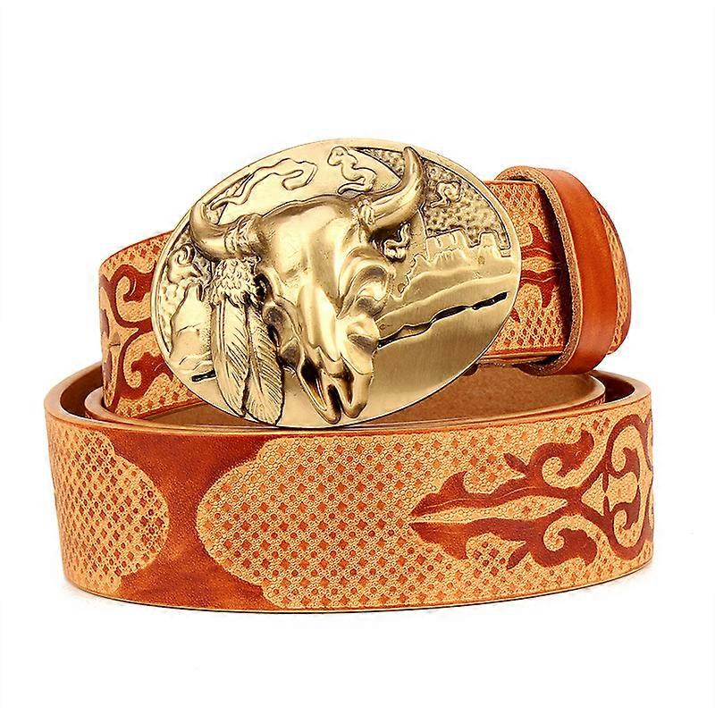 Men's Ethnic Style Cowskin Leather Belt Pure For Leather Copper Buckle Pattern Belt Retro Men Smooth Buckle Buckle Belts