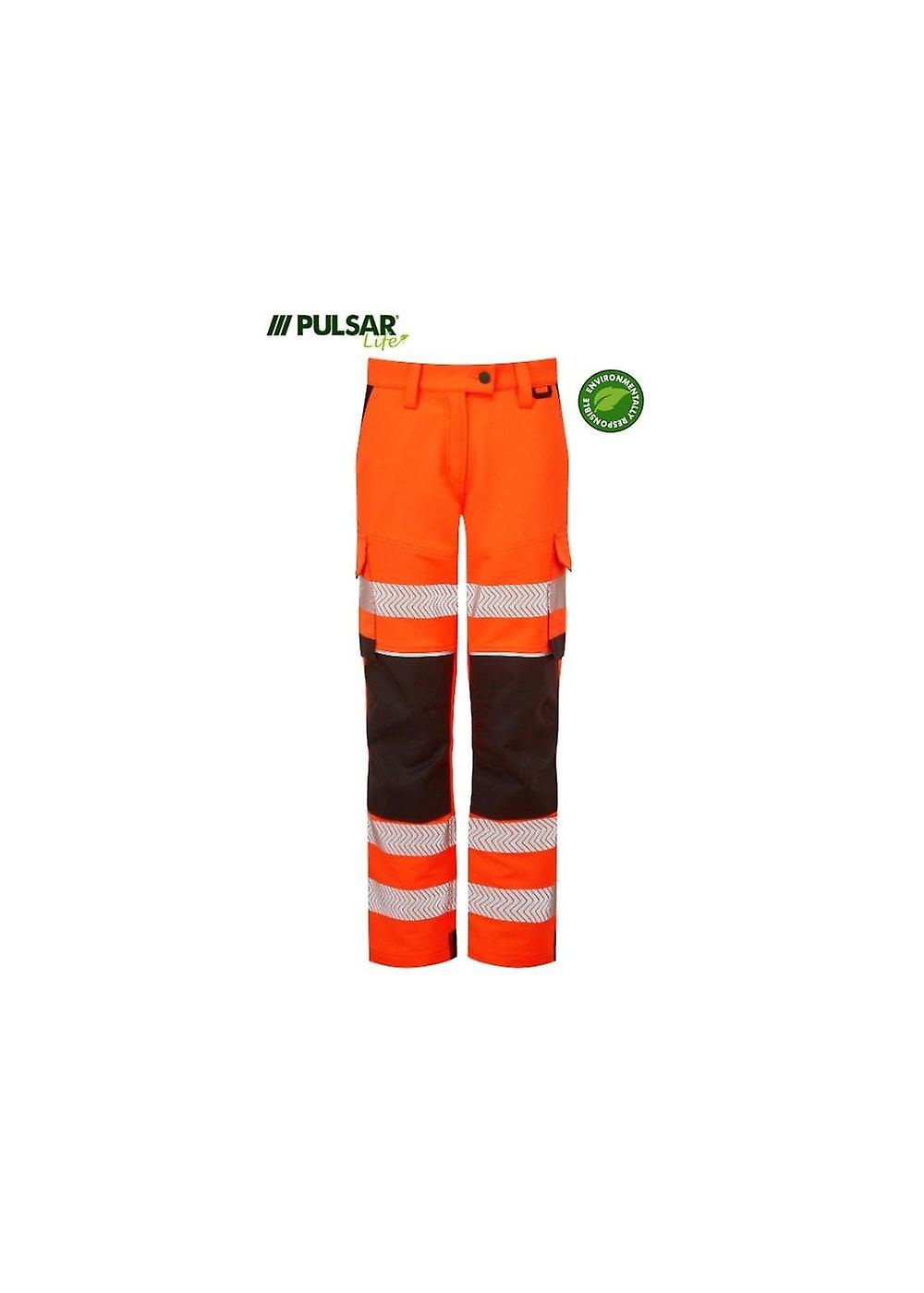 PULSAR LIFE GRS Ladies Stretch Combat Trouser LFE972 Rudolf® Bionic-Finish ECO, fluorine-free, durable water repellent finish Cordura® ECO 600D Stretch (GRS 100% recycled polyester) at knee and hem panels for increased durability4-way stretch for maximum comfort Tapered leg for optimum fitEasy grip recycled TPU pocket tabs Button made from recycled brass YKK® ECO NATULON Mechanically recycled zipper5cm wide, reflective tape on thighs and lower leg Additional reflective trim detail above knee and back of leg2x side pockets, Product Features 2x back pockets, 2x cargo pockets at the side thigh Hypalon utility loop at waist Knee pad compatible Fly fastening with inner waist adjustment system to find perfect fit Belt loops Packed in a recyclable plastic bag made from 100% recycled plastic 91% GRS recycled polyester, 9% spandex, 270gsm, Cordura® ECO 600D Stretch Do not wash in biological powder, wash as synthetics. Maximum 25 domestic wash cycles. 40 ° C domestic wash only, hang dry, do not iron. Do not tumble dry, do not dry clean, do not use bleach. Do not use fabric softener