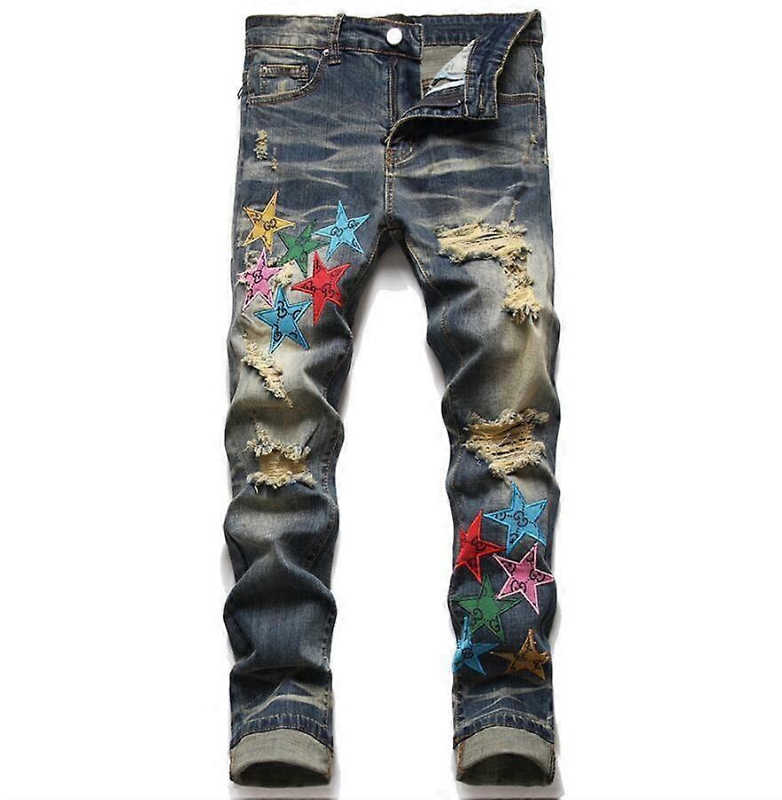 Men's Retro Denim Straight Leg Blue Punk Hip Hop Boys Ripped Pants Casual Stars
