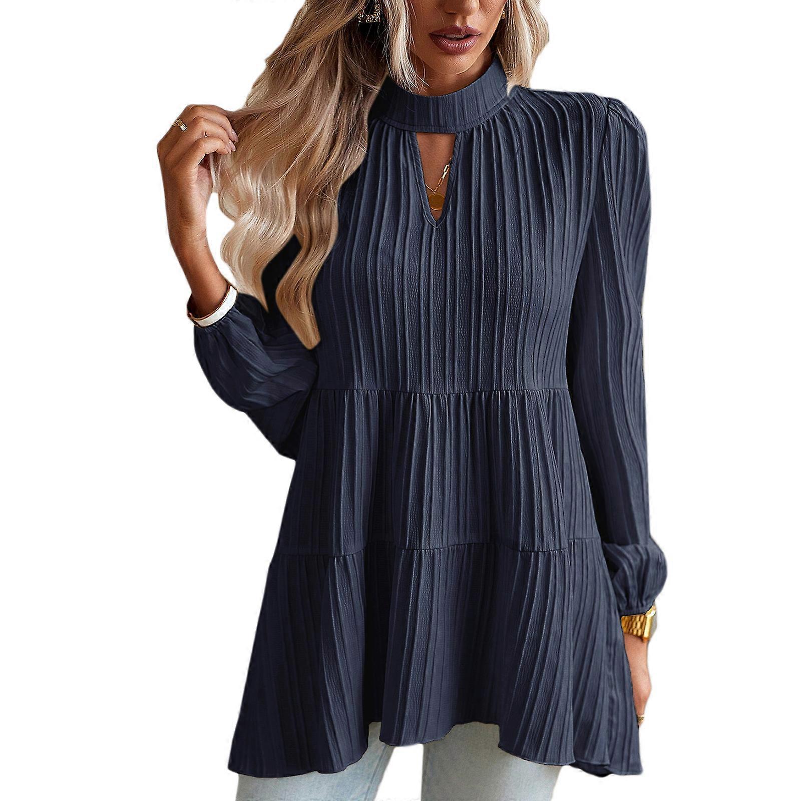Women's Cute Babydoll Peplum Tops Casual Loose Mock Neck Puff Long Sleeve Shirts Solid Color Fall Tunics Top Blouses Navy Blue XL
