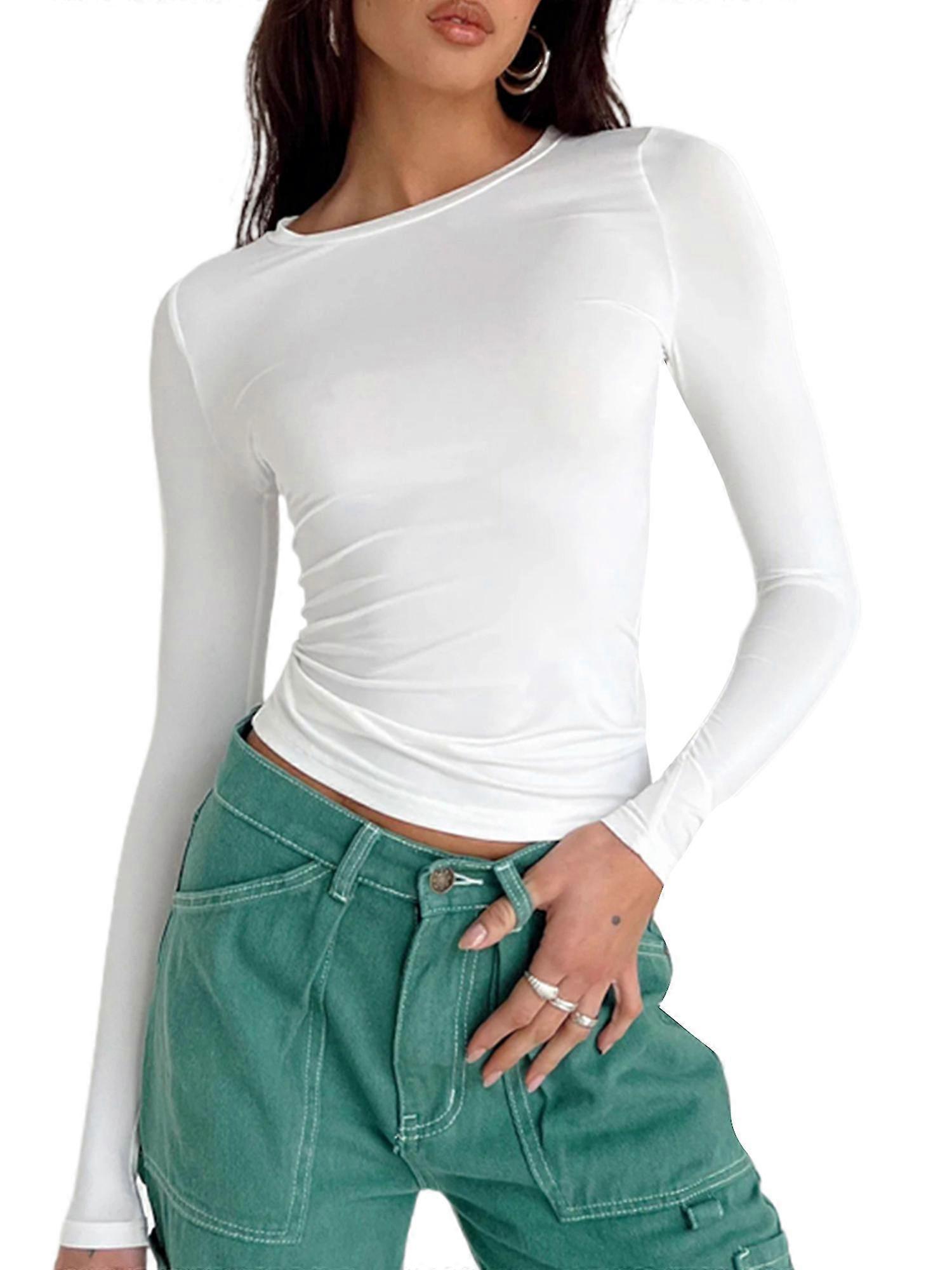 Women's Fall Casual Slim Fit Basic Crop Tops Solid Color Long Sleeve Crew Neck Pullover Tight Tee Shirts Streetwear