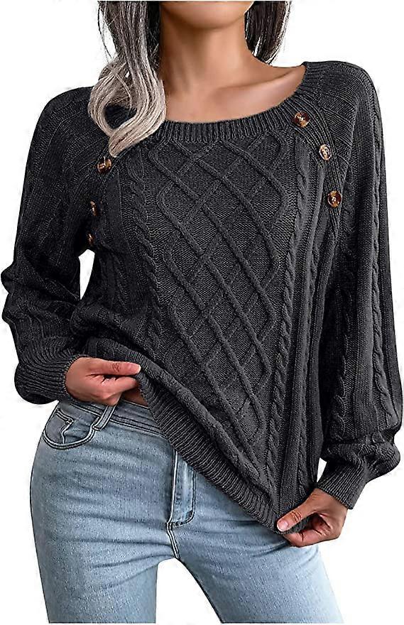 Womens Square Neck Button Cable Knit Long Sleeve Casual Loose Pullover Sweater Top Olive Fleece Pullover