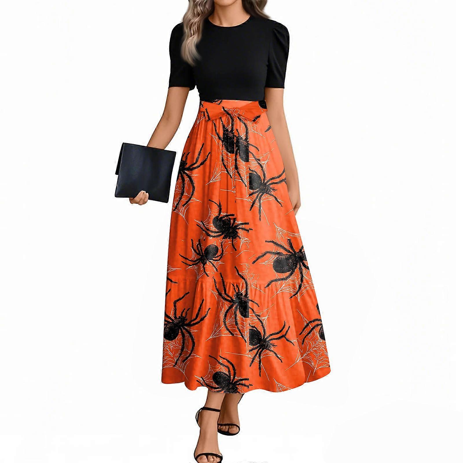 Women'S Dress Splicing Design Halloween Theme Dress Pumpkin Ghost Print Festival Wear Halloween Party Atmosphere Long Dress