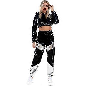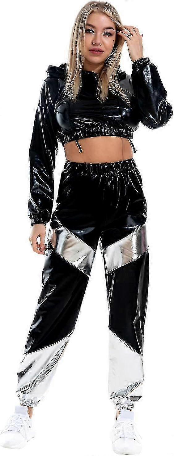 Women's Rave Outfit Shiny Crop Top Hoodie Metallic Casual Long Pants Hooded Workout Sweatshirt Disco Dance Clubwear