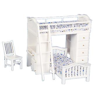 בובות בית לבן מיטת קומותיים להגדיר עם כיסא שולחן מיניאטורי ריהוט חדר שינה העשרה