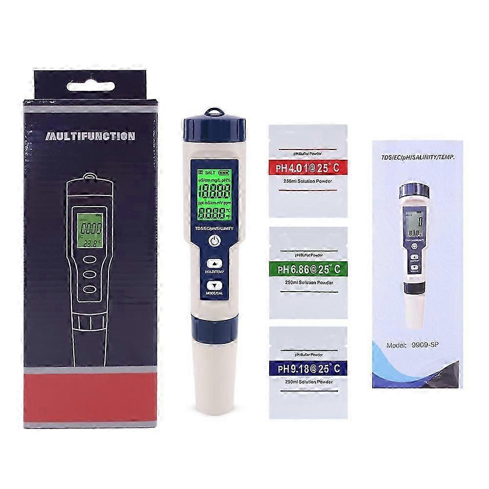 This product has a five-in-one function, which can measure ph, tds, ec, salinometer and temperature Measurable salinity (sea salt/freshwater salt) Sea Salt: Seawater salinity is the ratio of total dissolved solids to the weight of sea salt in seawater, usually expressed in grams per kilogram of seawater. (Measuring range 10.1-200.0ppt) Light salt: light water with salt content less than 0.5g/L (measurement range: 0.00-25.00% accuracy: 0.01-5.00% 5.10-25.00%) Waterproof grade: TP67 (it can still be used after falling into the fish tank) replaceable probe Auto Calibration Product Description Product parameters Conductivity test range: 0 to10000uS/cm 10.01-19.99ms 20.1-400mS/CM Resolution: 1uS/cm; 0.1mS/CM Accuracy: 2% of reading Tds test range: 0 to 1000ppm 1000ppm to 10000ppm 10.1 to 200.0ppt Resolution: 1ppm;; 0.1ppt Accuracy: 2% of reading Salinity measurement range: 0.00 to 25.00% Resolution: 0.01% Accuracy: 0.01-5.00% (0.1%) 5.10-25.00% (1%) pH test range: 0.01-14.00pH Resolution: 0.01pH Accuracy: 0.05pH Temperature Compensation: Automatic Temperature Compensation (ATC) Working environment: 0 to 60.0C (32.0-140F); RH 100% TDS factor: 0.4to 1.0 Temperature range: 0.1-60.0 32.0-140 Temperature accuracy: 0.5 Temperature resolution: 0.1C/F Auto power off: about 5 minutes 3x1.5LR44 Display: Support backlight Waterproof grade: IP67 Power consumption: 2.9 mA, power consumption is 0 when off The accuracy is relatively accurate within 150ppt, and the deviation above 160ppt is relatively large. Note: After each use, be sure to clean the electrode