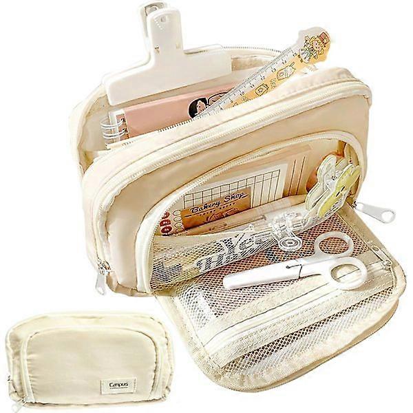 (Beige) Large capacity pencil case Big three-ply zipper pencil pouch office school stationery for teenage girls boys S