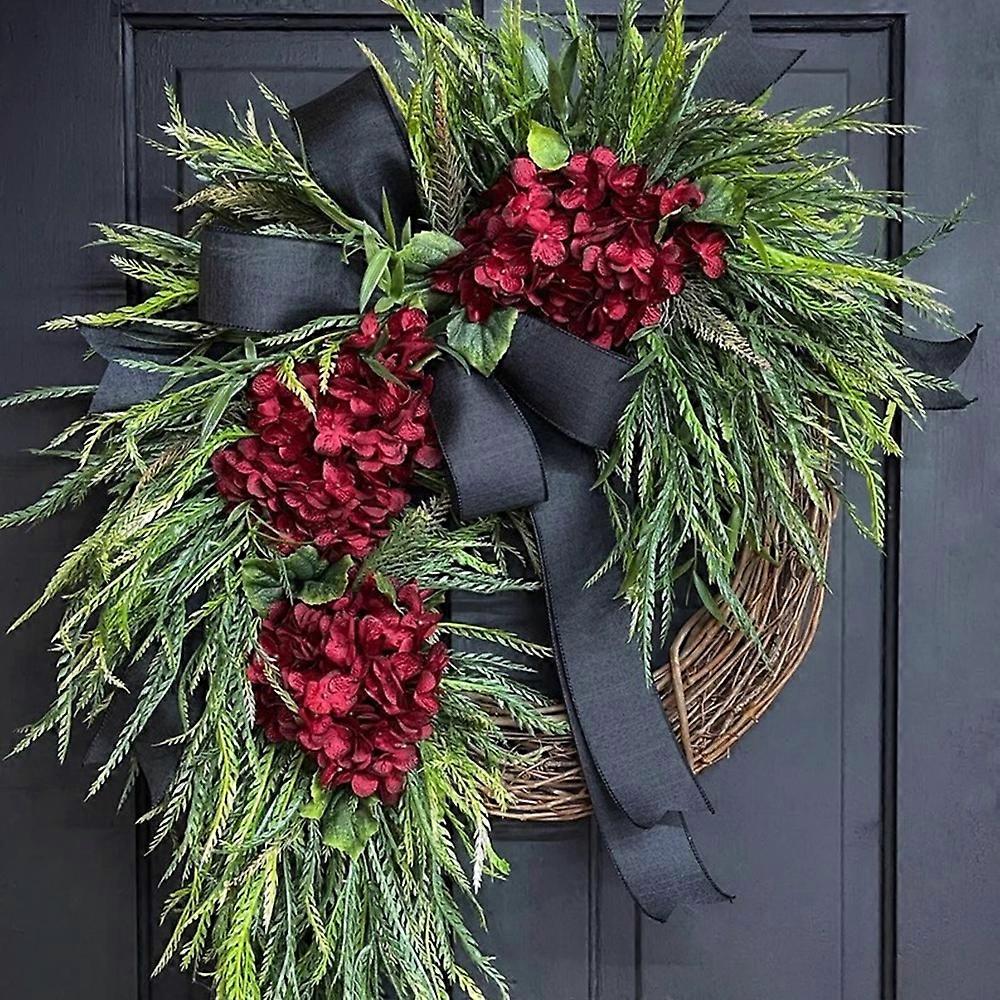 Farmhouse Hydrangea Wreath Front Door Decor Artificial Floral Garland For Home Rustic Style Wine Red / Black
