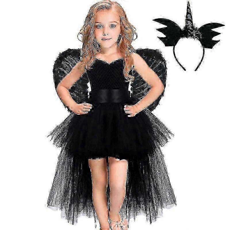 Girls Black Devil Unicorn Tutu Dress V-Neck Train Fallen Dark Angel Fancy Party Dress Carnival Halloween Costume for Kids 1-14Y