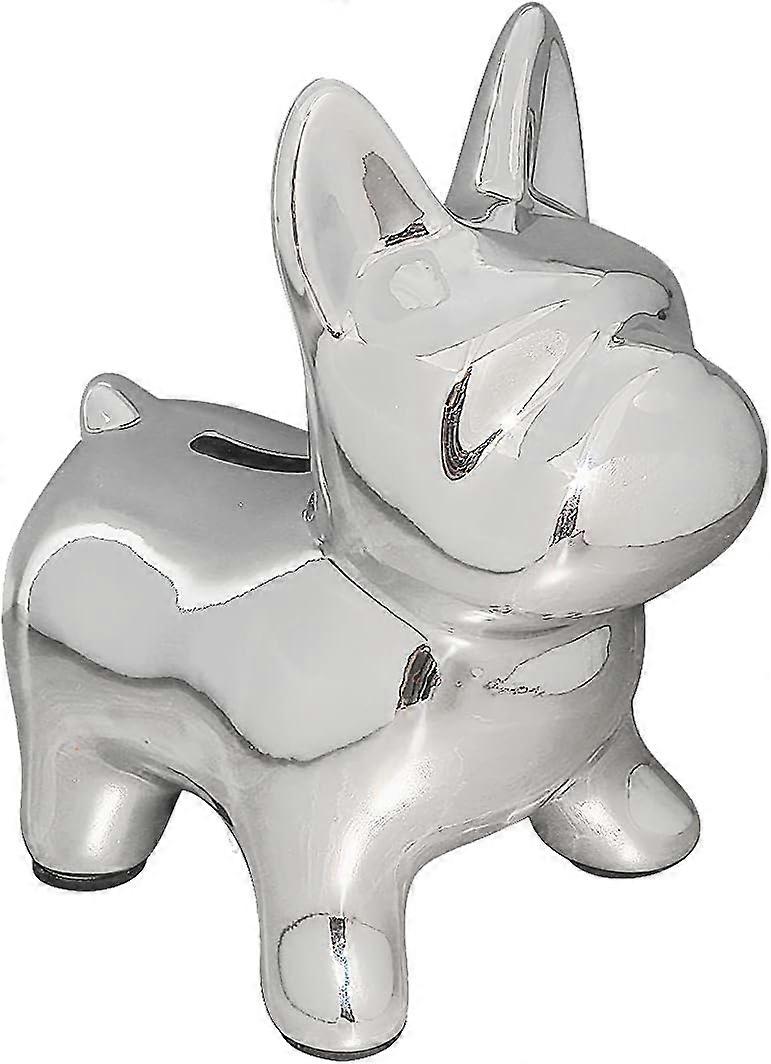 Ceramic Bulldog Piggy Bank for Boys Girls,Money Box for Kids, Coin Bank Keepsake with Plastic Stopper, French Bulldog Saving Jar, Nursery Dcor (Silver
