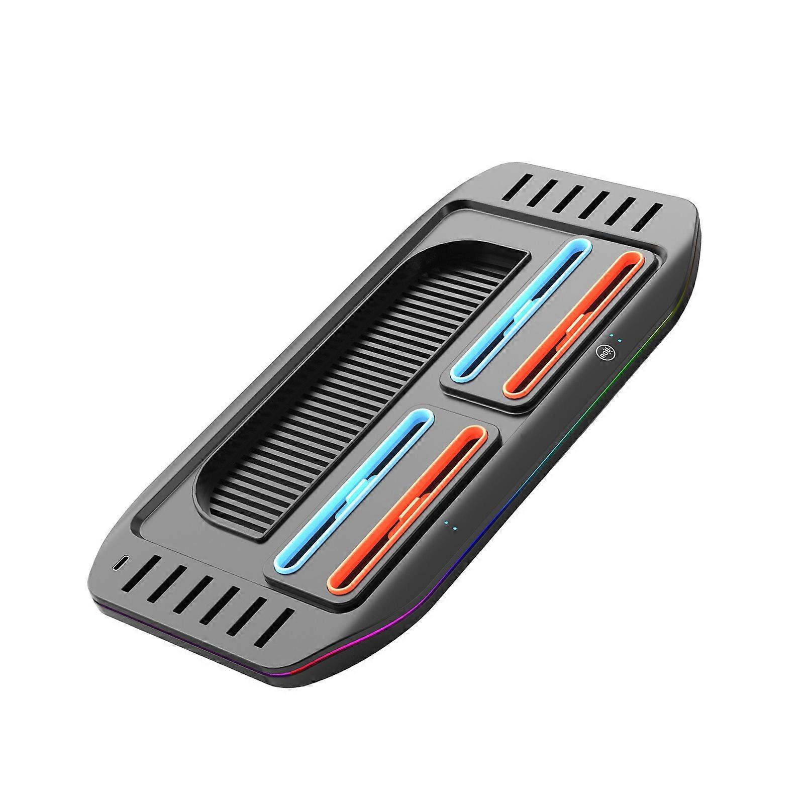 Features: This is a multifunctional charging base used in conjunction with original base, magnetic design. With 4 charging slots and supports charging 1-4pcs controllers for NS2 simultaneously, with charging indication light. Equipped with Type C port, supporting original base to provide power input for the product. With touchable switching button, 9 adjustable lighting effects. Equipped with 12 game card storage slots for easy storage and use of game cards. Specifications: Component: ABS plastic Size: approx. 32x16cm/12.6x6.3inch Applicable Model: for ns2 Game Console Input: DC5V Single handle charging current: 200mA Charging time: about 2.5-3.5 hours Package Includes: 1 Piece Charging Dock 1 Piece USB Cable note: It is recommended to disconnection the power supply after the host goes into sleep mode. If the power is connection during sleep mode, the light may flashing briefly, and without time pattern for the light to flashing once! Other accessories demoed in the pictures is not included. Please allow 1-2cm errors due to manual measurement. Please allow for slight color differences due to different display resolution.