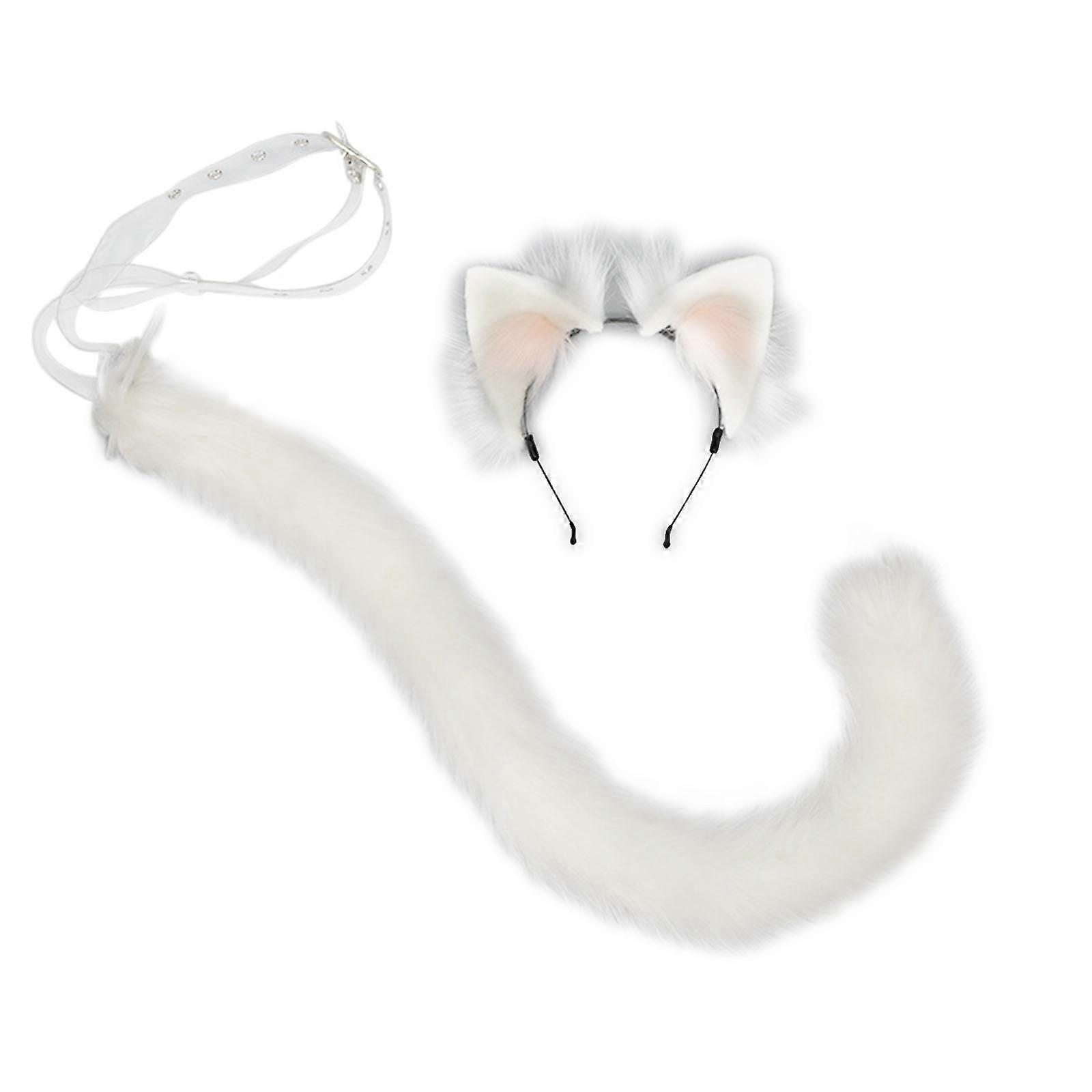 Handmade Plush Fox Wolf Ears Headband and Faux Fur Tail for Halloween Cosplay Party Costumes Accessories Kids-Adults White