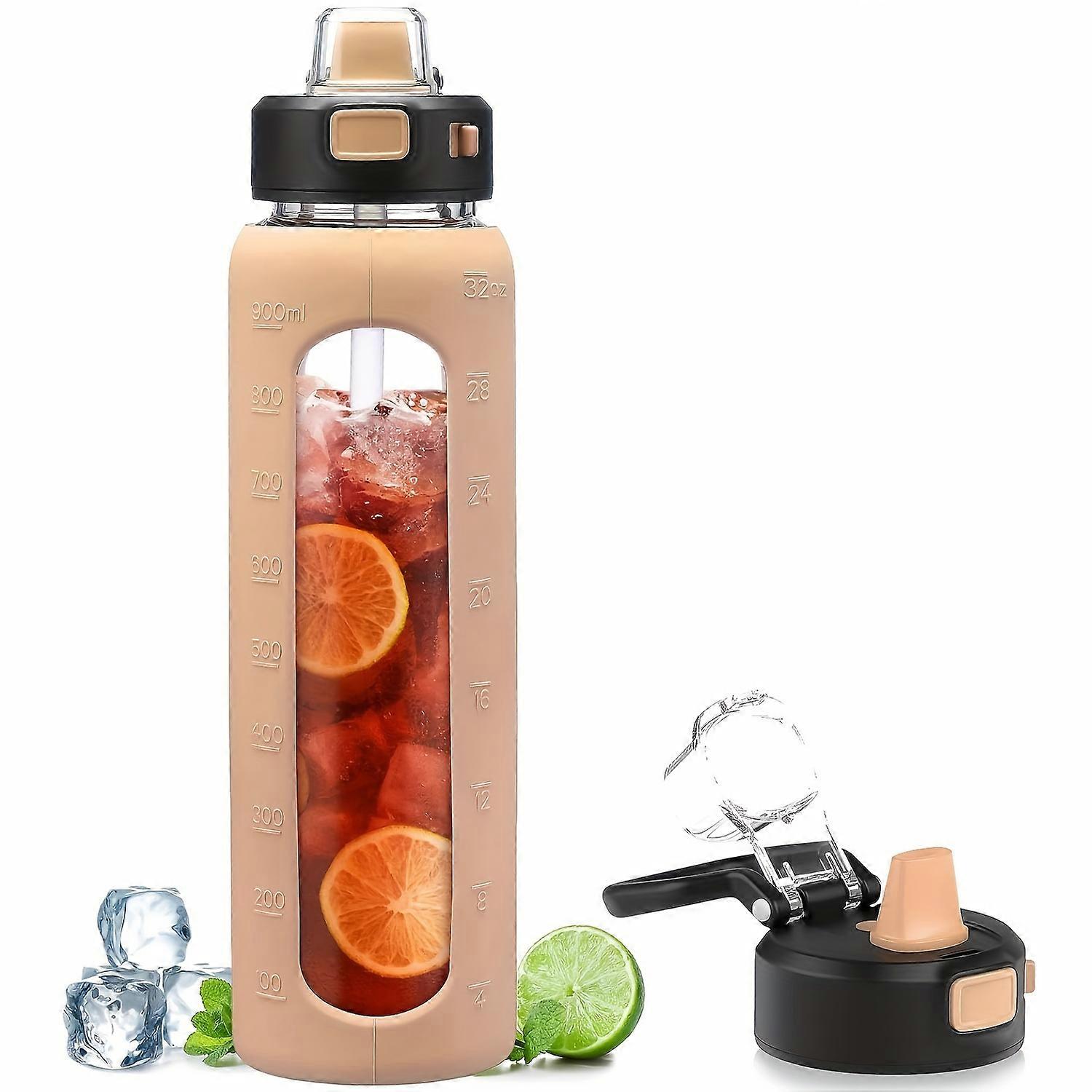 32oz Glass Water Bottle With Straw, Water Bottles With Time Marker And Silicone Sleeve, Glass Water Bottle For Gym, Sports, Workout