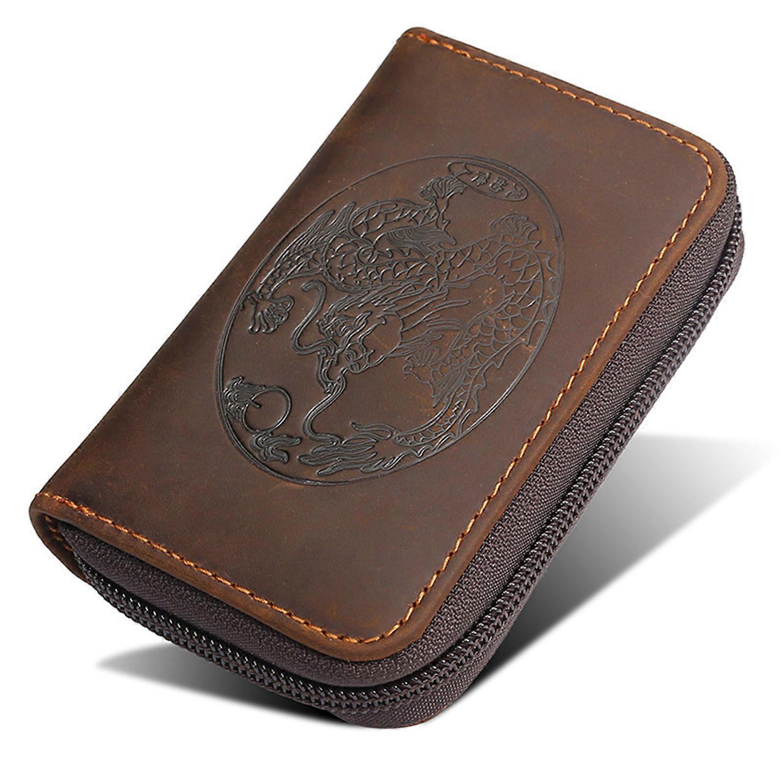 Men Faux Leather Business Card Holder Bag Small Brown Zipper for Case ID Credit Cards Wallet Coin Purse with Dragon Patt