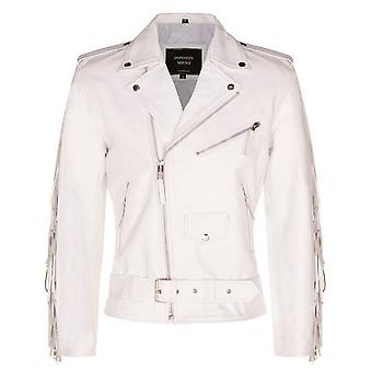 Mens White FRINGE Brando TASSELED Motorcycle Retro Cow Hide Leather Biker Jacket