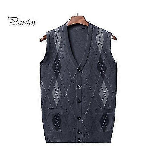 Men Autumn Winter Cardigan Sweater Single-breasted V Neck Sleeveless Buttons Color Matching Stretchy Pockets Knitted Vest Mid-aged Male Top