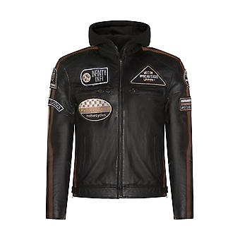 Mens Black Leather Biker Hood Racing Moto Jacket