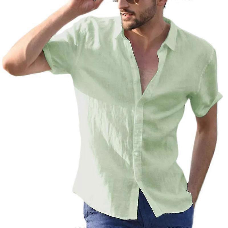 Mens Short Sleeve Linen Shirts Summer Solid Loose Casual Dress Shirt Blouse Tops