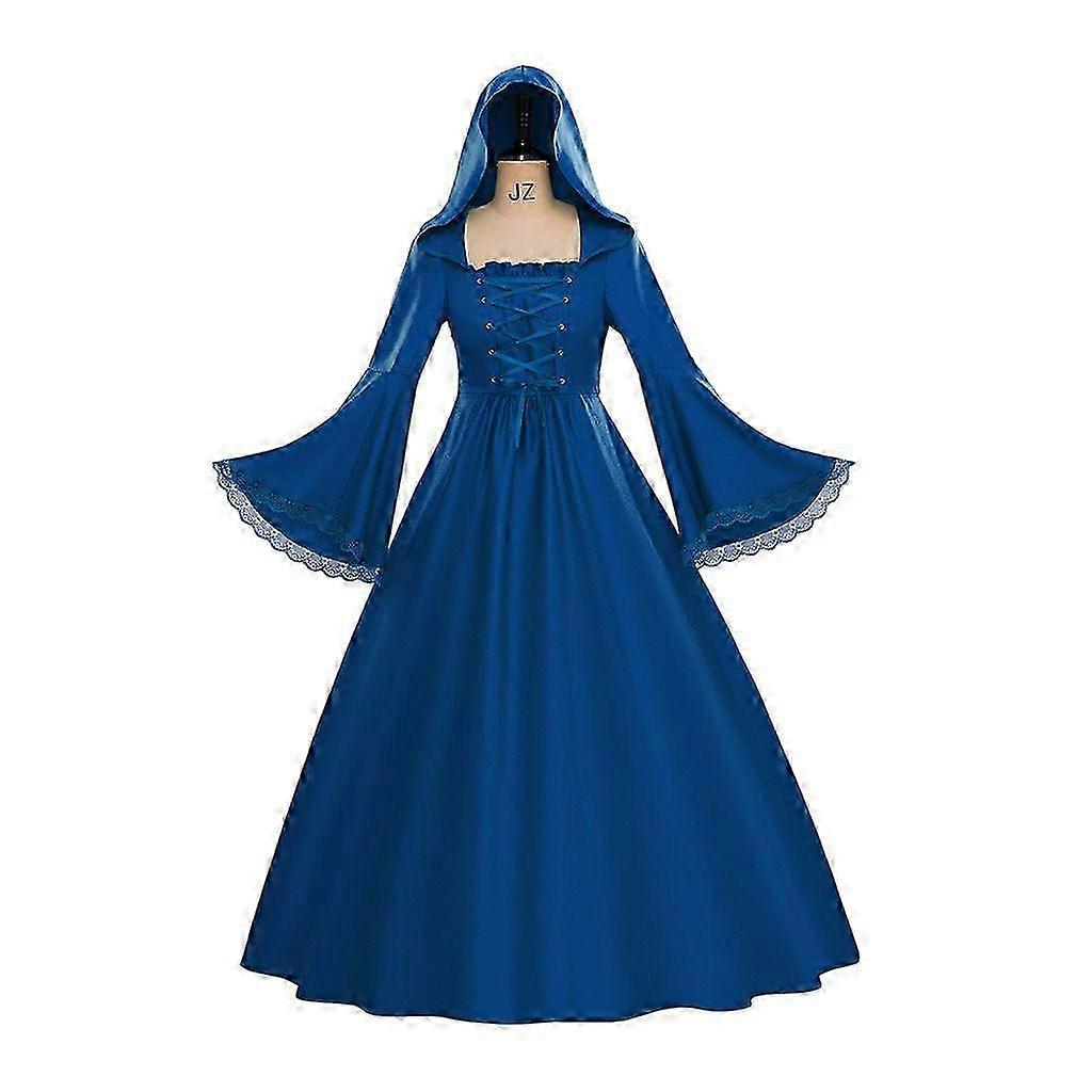 Gothic Hooded Lace-Up Dress Black Bell Sleeve Medieval Witch Costume Renaissance Cosplay Gown for Women