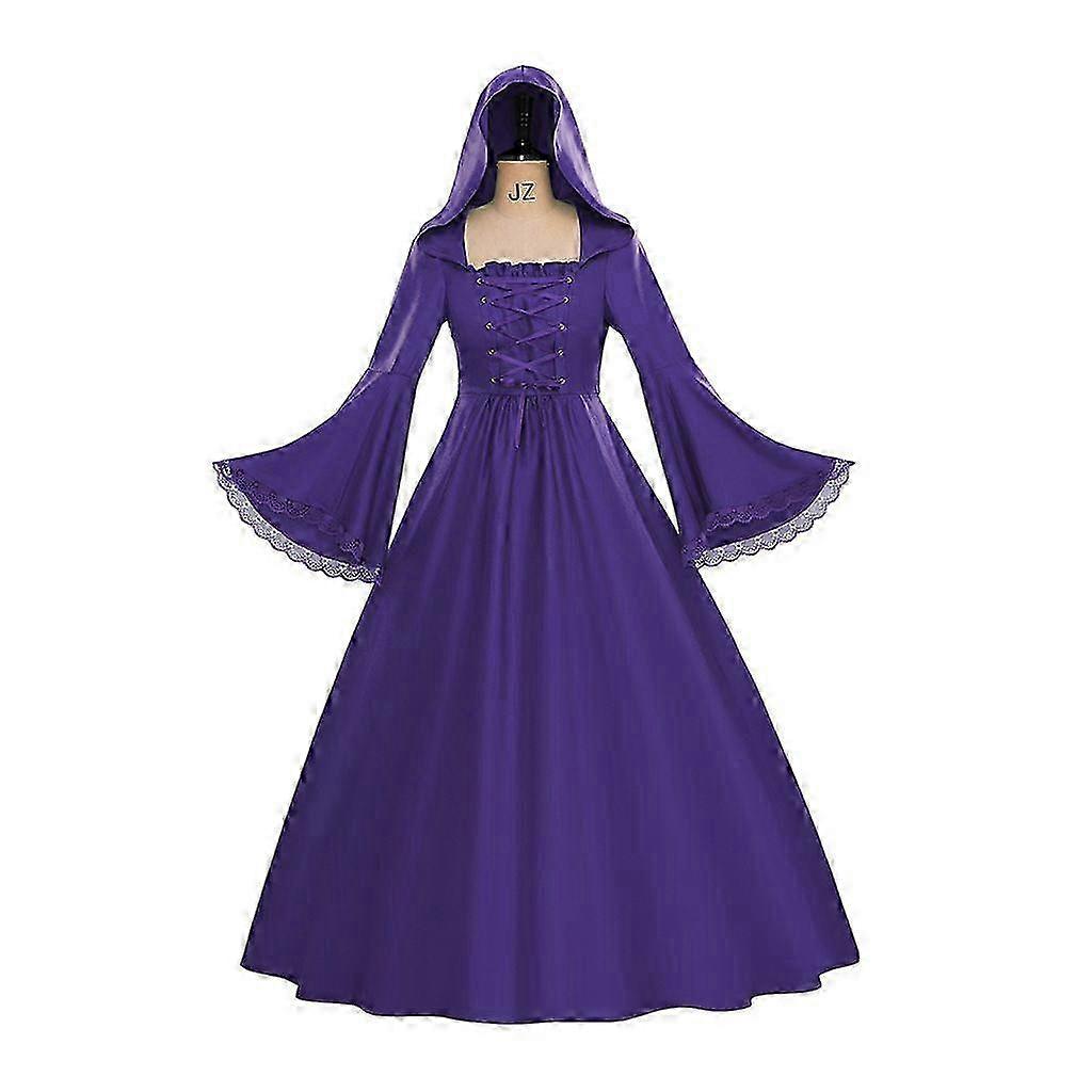 Gothic Hooded Lace-Up Dress Black Bell Sleeve Medieval Witch Costume Renaissance Cosplay Gown for Women