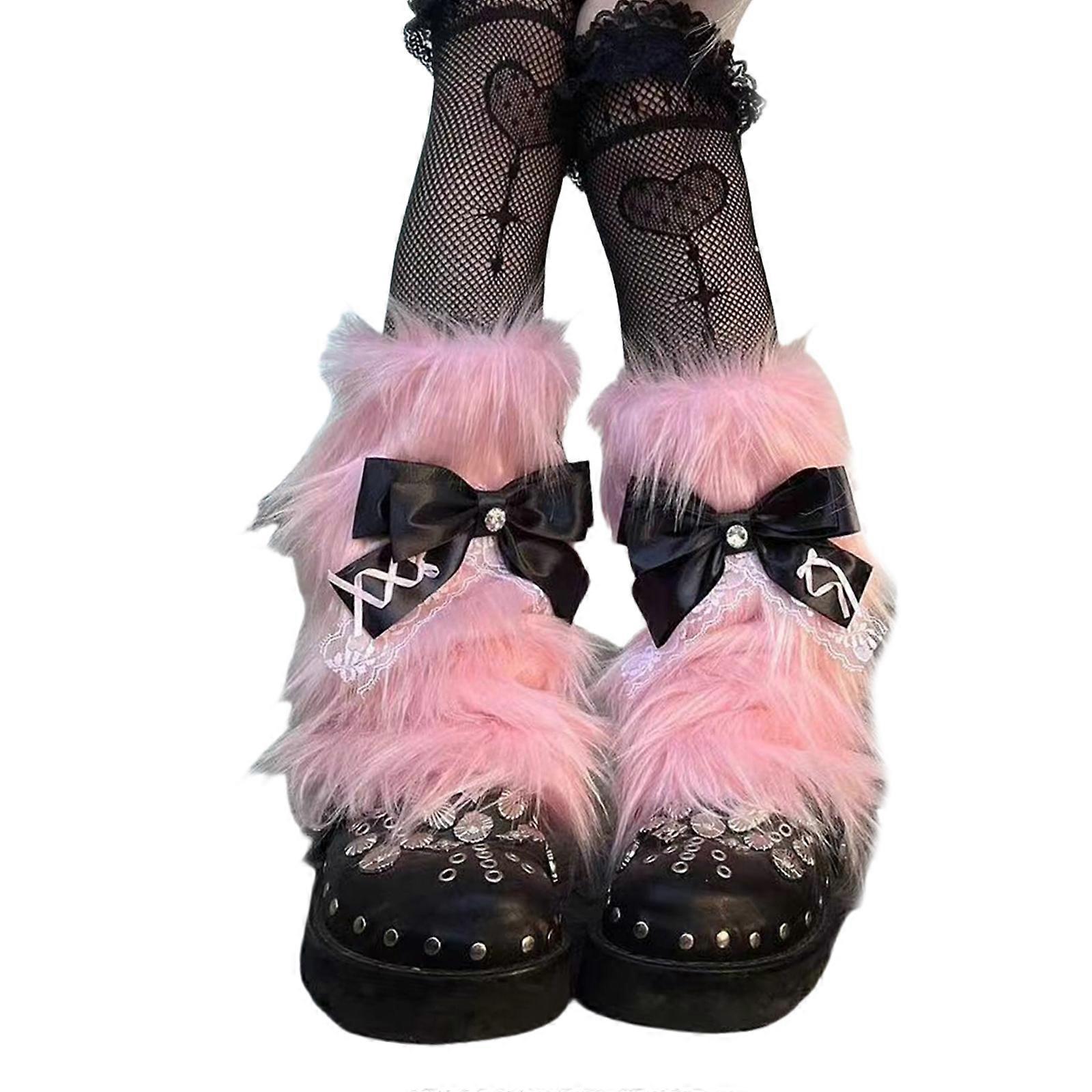 Gothic Punk Furry Leg Warmers for Women Bowknot Lace Fuzzy Boot Cuffs Leg Cover with Fishnet Thigh High Stockings Outfit Pink