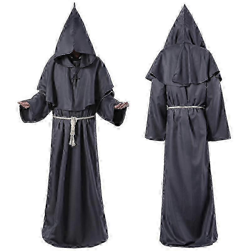 Monk Robe Medieval Renaissance Priest Wizard Cloak Cosplay Costume Material:Hood Friar monk wizard priest robe---- Made of polyester,softness and comfort.Rope belt length 94.5 inch and crosses necklace Accessory perfect for friar monk priest farther wizard preacher cosplay costume. Super cool design and great quality,medieval renaissance hooded religious costume robewith waist belt and crosses necklace,It's way too attractive for friar monk priest pagan wizard fancy role play costume! Perfect for:Medieval renaissance knight religious theme party,Prom,stage performance,fantasy events,renaissance faire,comic con,Halloween cosplay parties,dress-up play,LARP,reenactment activities,and so on. Package includes: Monk hooded robe *1,cowl hat*1,rope belt*1,crosses necklace*1-------4 piece set.For best effect ironing before wearing.