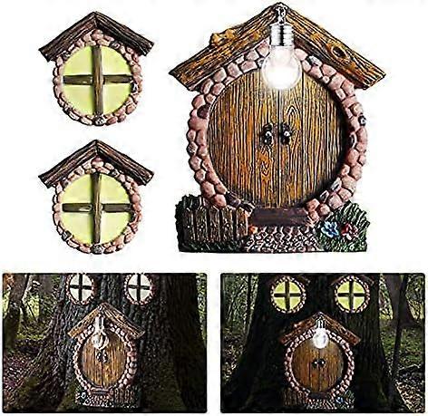 Miniature Fairy Gnome Home Window and Door with lamp for Trees Glow in Dark Door and Windows, Yard G