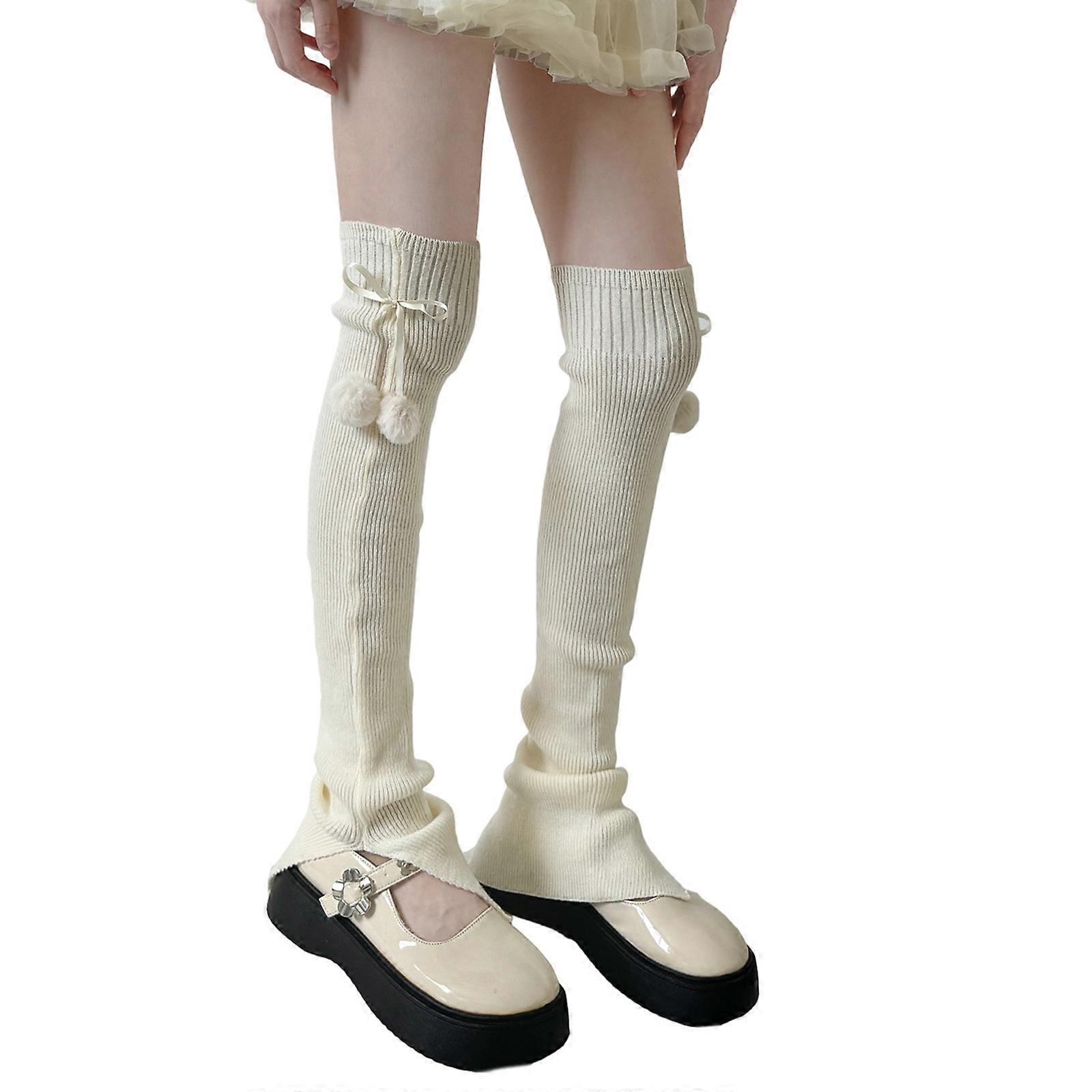 Women’s Stretchy Over The Knee Socks Furry Ball Decors Breathable Knitted Leg Warmers For Fall Winter Indoor Outdoor Use Milky white