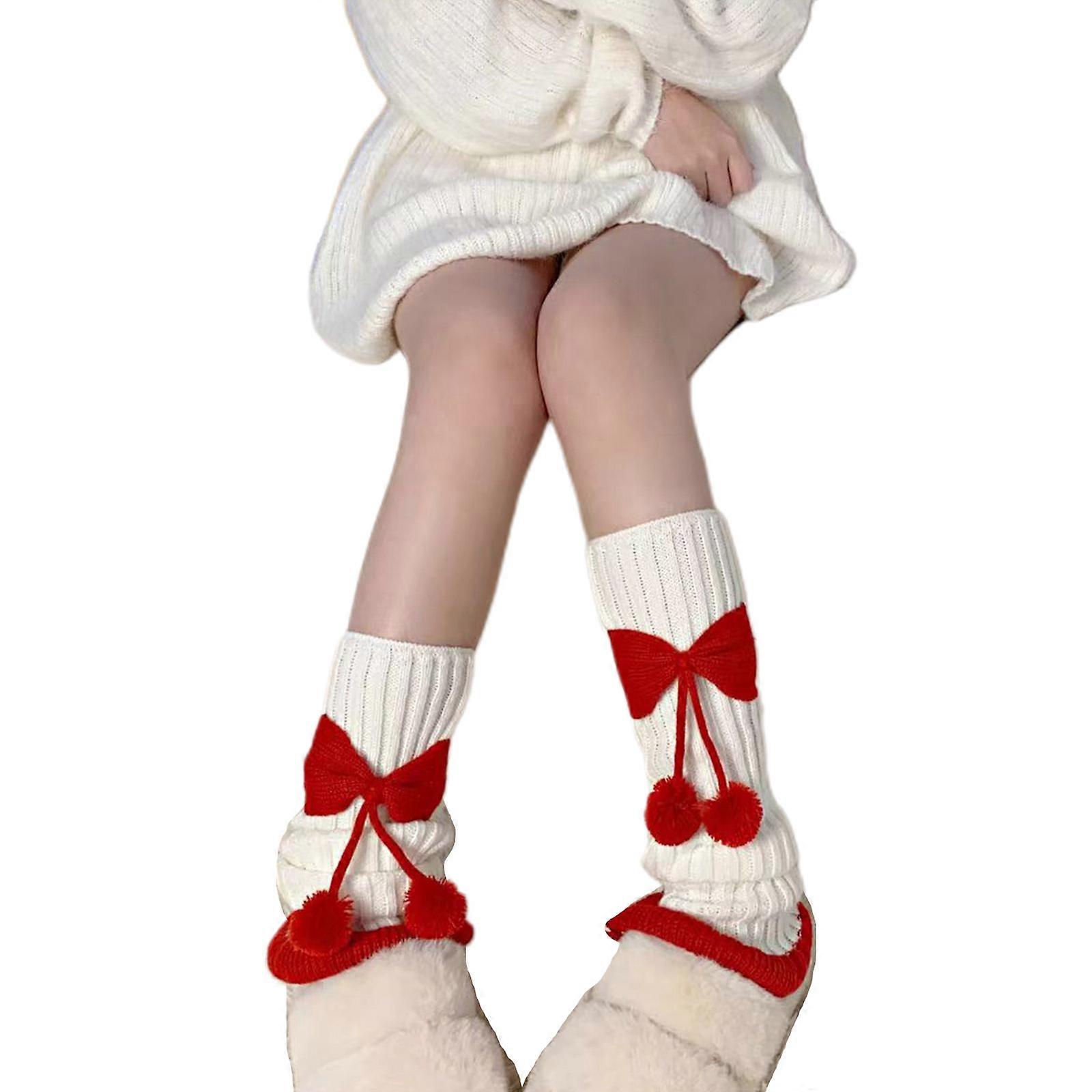 Ribbed Knitted Leg Warmers Socks Women Colorblock Cute Pompom Bowknot Ruffled Flared Hem Foot Cover Boot Cuffs Stockings Red bow on white