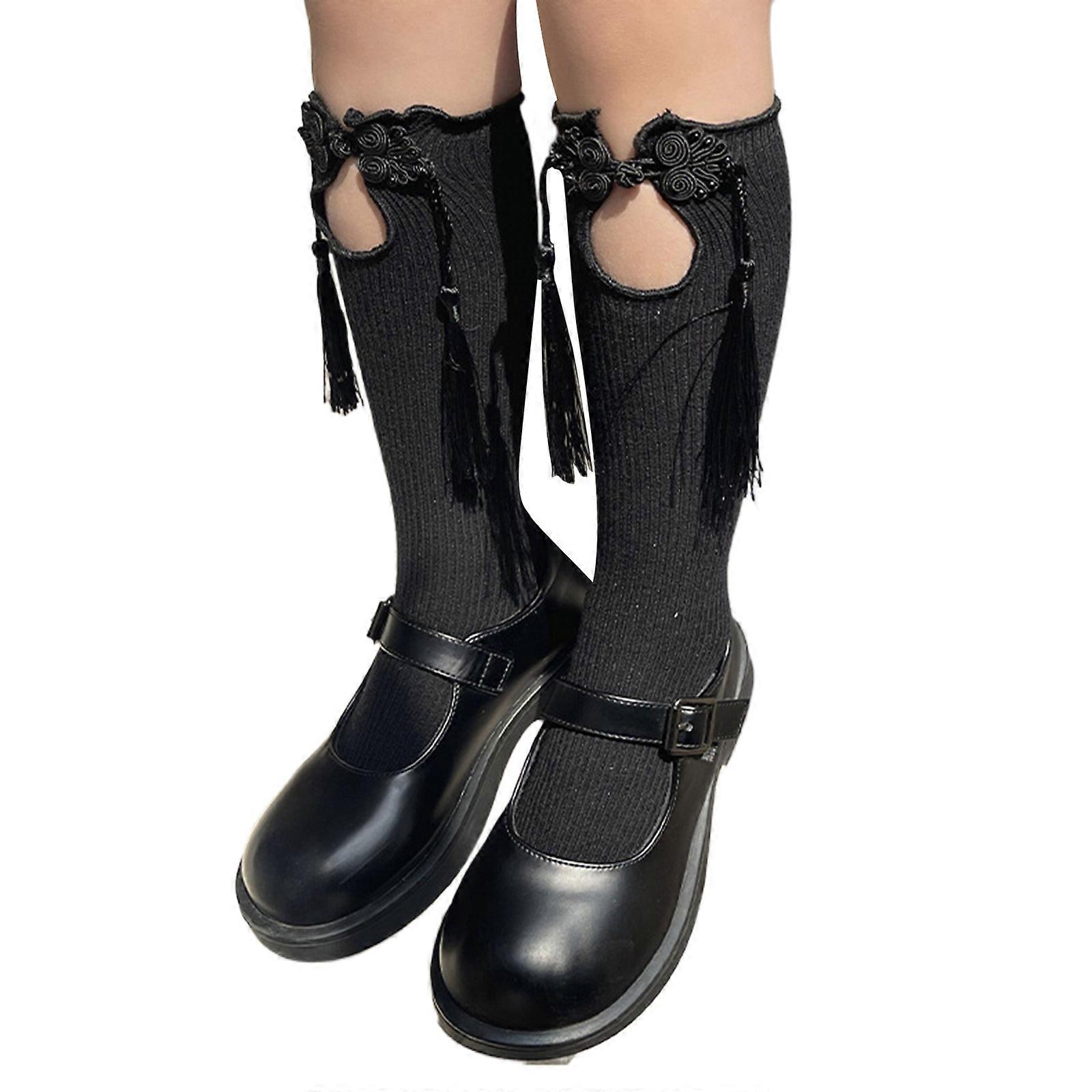 Child Dress Socks for School Activity Spring Antimosquito Knee High Socks for Kids Stretchy Chinese Knot Socks for Girl Black black tassel