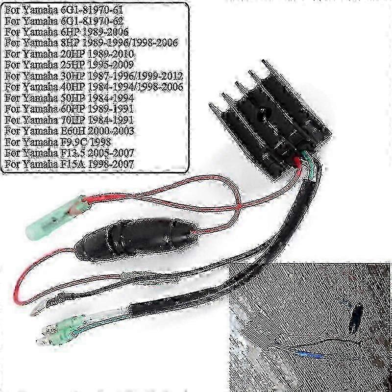 Regulator rectifier For Yamaha 6HP 8HP 20HP 25HP 30HP 40HP 50HP 60HP 70HP E60H F99C F135 F15A 6G1-81970-62 6G1-81970-61 p20241126689<br>Motorcycle regulator rectifier<br>Input Voltage: DC 12V<br>Color: as in picture<br>Easy to install,just plug and play<br>Prevents over charging battery and improve charging capability<br>With heat sink fins for better cooling<br>Fitment:<br>For Yamaha 6G1-81970-61<br>For Yamaha 6G1-81970-62<br>For Yamaha 6HP 1989-2006<br>For Yamaha 8HP 1989-1996/1998-2006<br>For Yamaha 20HP 1989-2010<br>For Yamaha 25HP 1995-2009<br>For Yamaha 30HP 1987-1996/1999-2012<br>For Yamaha 40HP 1984-1994/1998-2006<br>For Yamaha 50HP 1984-1994<br>For Yamaha 60HP 1989-1991<br>For Yamaha 70HP 1984-1991<br>For Yamaha E60H 2000-2003<br>For Yamaha F9.9C 1998<br>For Yamaha F13.5 2005-2007<br>For Yamaha F15A 1998-2007