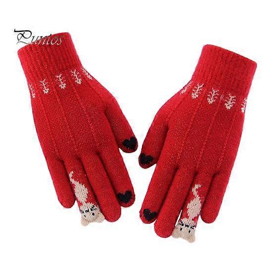1 Pair Women Winter Gloves Jacquard Thickened Knitted Five Fingers Touch Screen Cartoon Cat Decor Anti-slip Cold Weather Driving Golfing Skiing