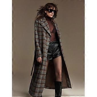 New ern Urban Style Brown Plaid Wool Blend Notched Collar Long Sleeve Cinched Waist Real Pocket Women Wool Blend Blazer Jacket, Business Casual, Work