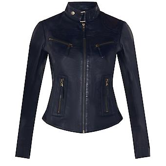 Ladies Leather Jacket Classic Biker Navy Slim Fit Jacket