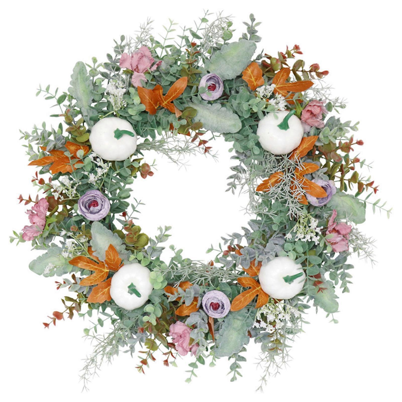 Artificial White Pumpkin Wreath with Green Leaves Hanging Garland Pendant for Thanksgiving Halloween Fall Front Door