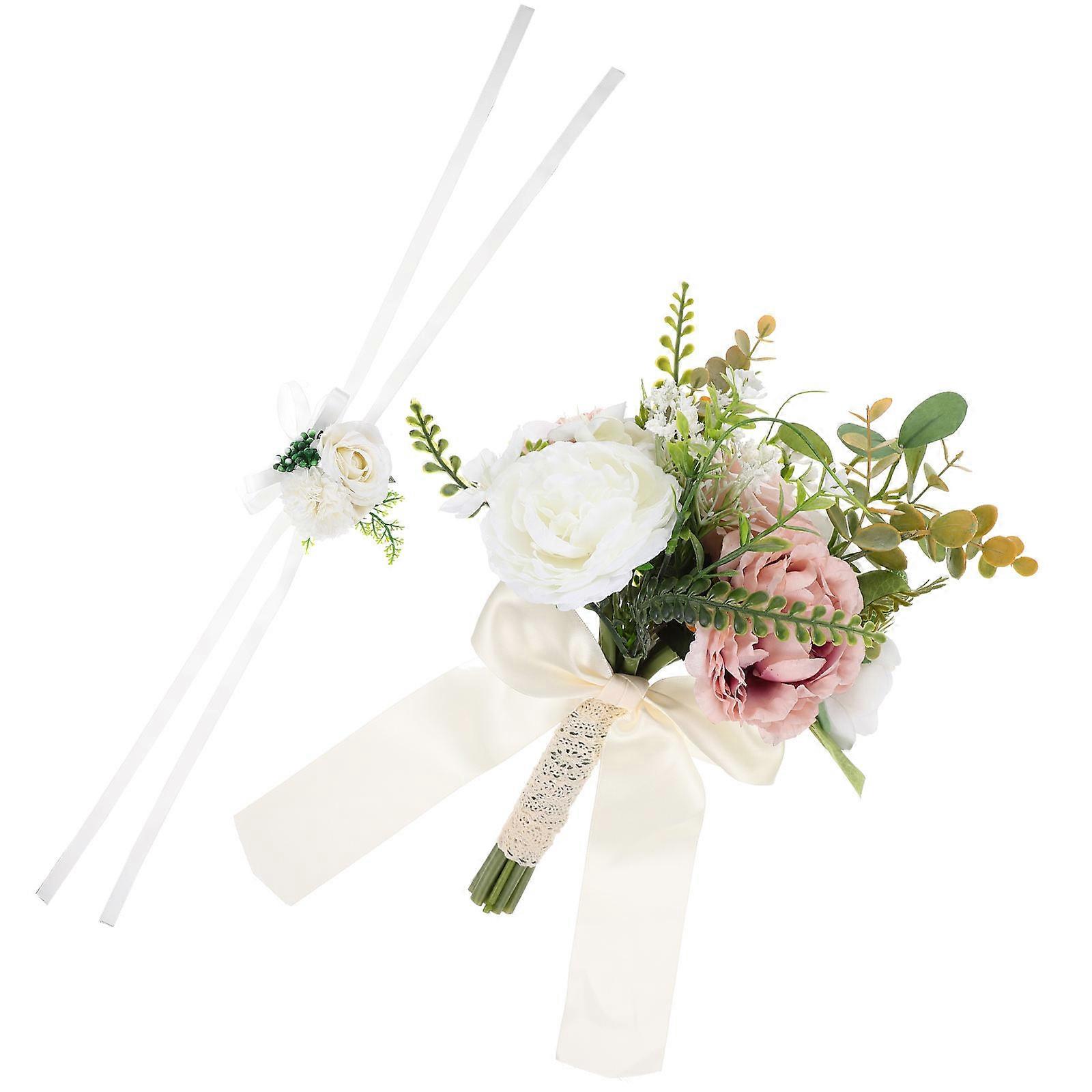 Rose Bridal Bouquet and Wrist Corsage Set Artificial Flower Arrangement for Wedding Decor, Photo Props, and Romantic Wedding Accessories with