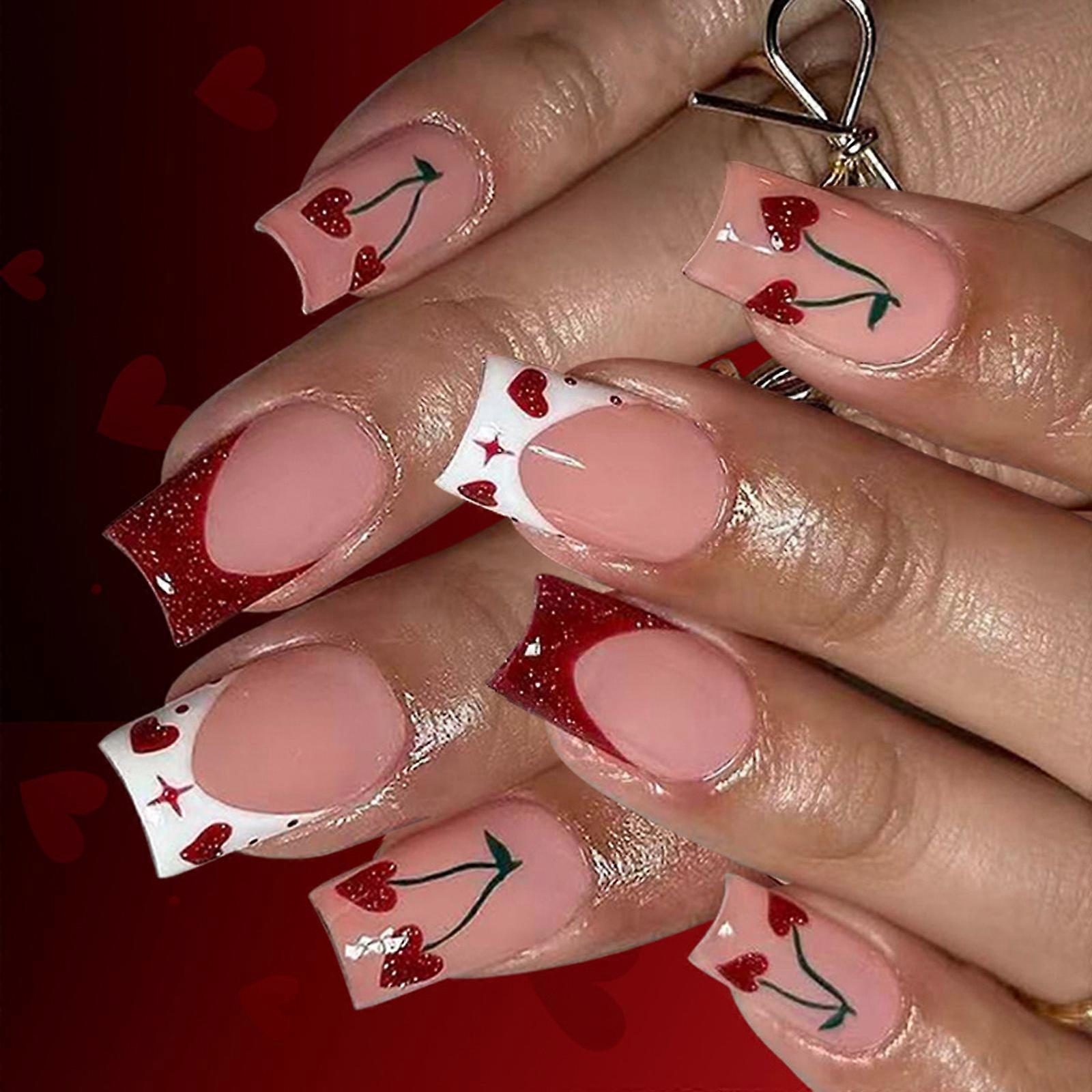 Pack of 24 Valentine Red Press On Nail with Heart Glitters Design Short False Nail for Party Date Night Manicure Multicolor