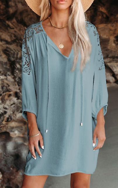 New Women's Beach Sunscreen V-neck Tie Shoulder Lace Cotton Long Dress With Three-quarter Sleeves