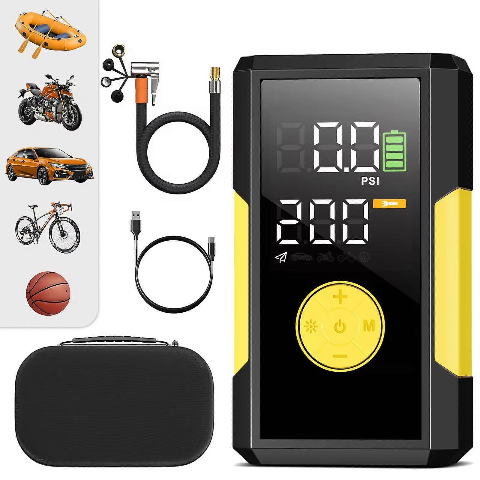 Rechargeable Air Compressor 200psi Portable Electric Tire Inflator for Car Bicycle Motorcycle Air Pump Tire Inflator Color: Red Size: 147*83*48mm/5.78*3.26*1.88 inches Digital Screen: 60*50mm/3.2 inches Battery Capacity: 3.7V/10000mah Type-c Input: 5V/3A9V/2A LED Light Power: 2w 120°C High Temperature Protection Product Weight: 500g Package Weight: 850g Cylinder Specifications: 17MM Output Air Pressure: 200PSI Air Flow: 35L/min Cable Length: 30cm Attention! Some packages may have JFEGWO printed on them, please don't mind, the outer packaging is universal Inflation speed: 1 minute from 29psi to 35psi, based on r15 tires Capacity: 3.7V/10000mah Maximum peak pressure: 200psi/13.8BAR/999KPA Air output: 35 LPM (liters/minute) Screen size: 65*50mm/3.2 inches Rated inflation pressure (PSI): 36psi/2.5bar/248kpa Inflation mode: 5 modes (free setting, car, motorcycle, bicycle, ball) Input interface type: USB-C (TYPE-C) Input interface parameters: 5V/3A;9V/2A Low pressure alarm: Yes High temperature alarm: Yes Number of lights: 1 (6 0.5W lamp beads) Lighting power: 1W SOS function: Yes Power display: 4 power display grids Accessories and packaging: 4-piece air hose extension cable, 1 A-C fast charging cable 2A, EVA box