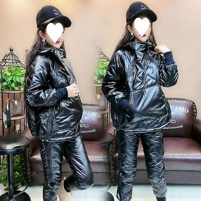 Winter Hooded Glossy Down Cotton Two Pieces Sets Casual Thicken Waterproof Sweatshirts Conjuntos High Waist Jogger Pants