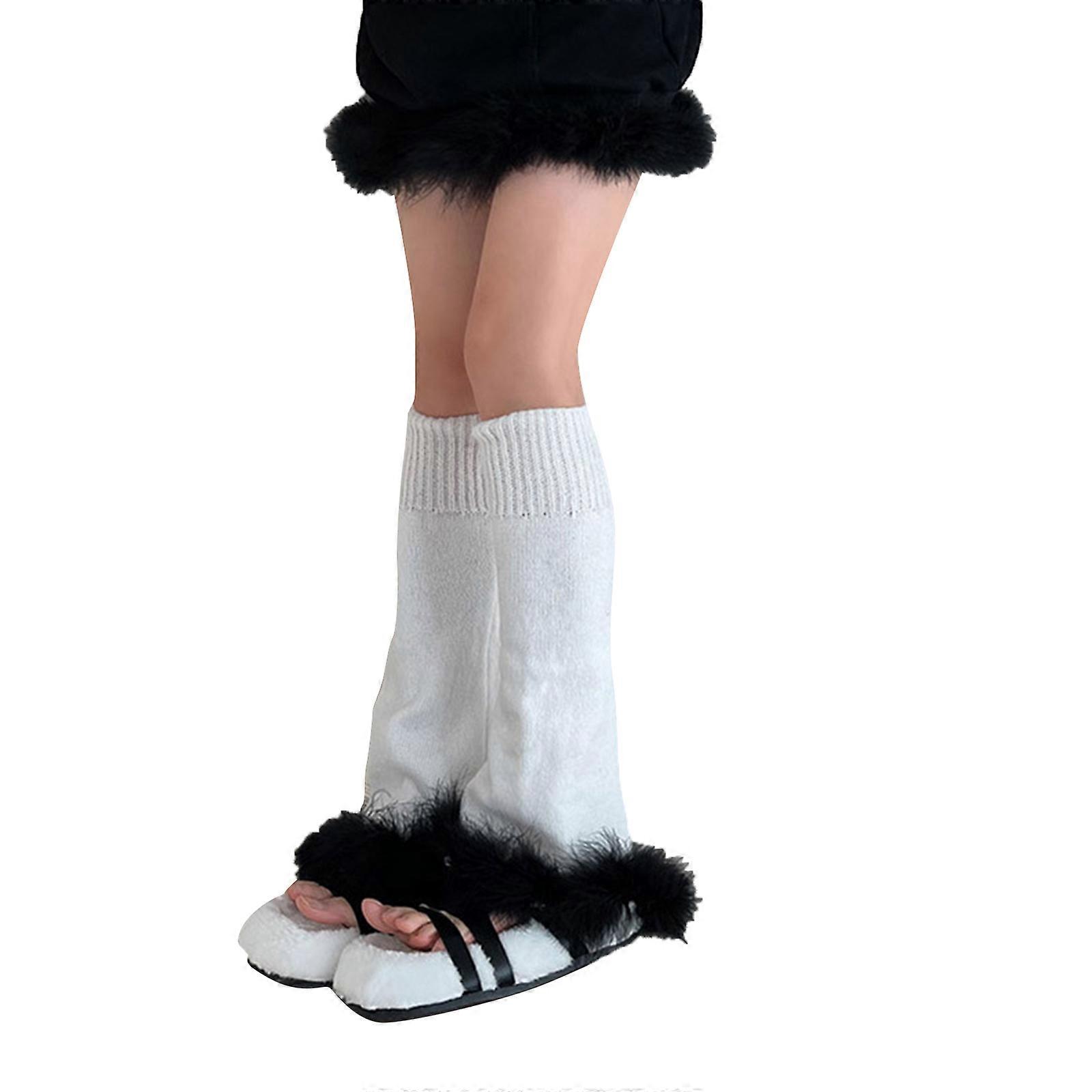 Winter Autumn Knitted Leg Warmers Gothic Solid Color Foot Covers Furry Plush Flared Hem Knee High Socks for Women White socks and blac